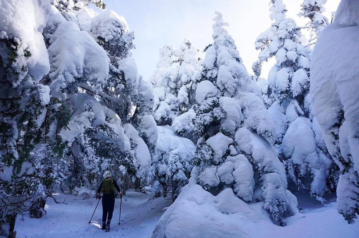 If sledding is not your thing, skiing the mountain is a whole different adventure I recommend. The skinning route starts by going up the Burrows trail and eventually forks off into the glades of Bald Hill, on the western side of the mountain. Once you reach these glades, it's a bit of a “pick your own adventure” to the top. It's always nice when someone has set a good skin track before you to follow. I’ve had some of my favorite backcountry skiing days here. The views of the top of Camel’s Hump from the top of Bald Hill are stunning.