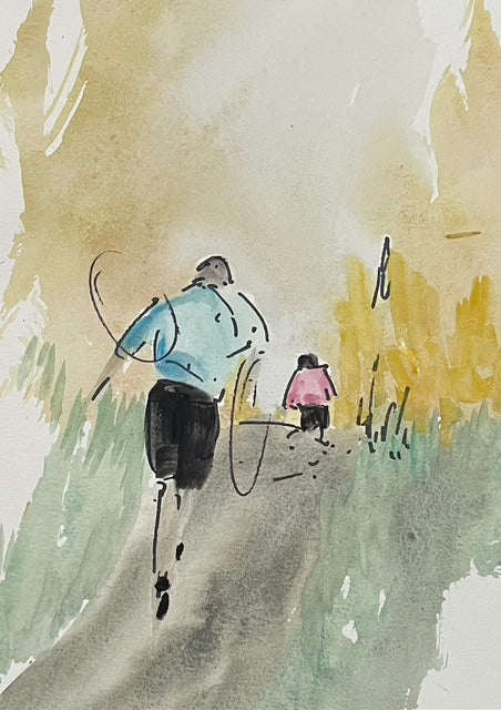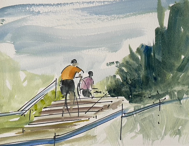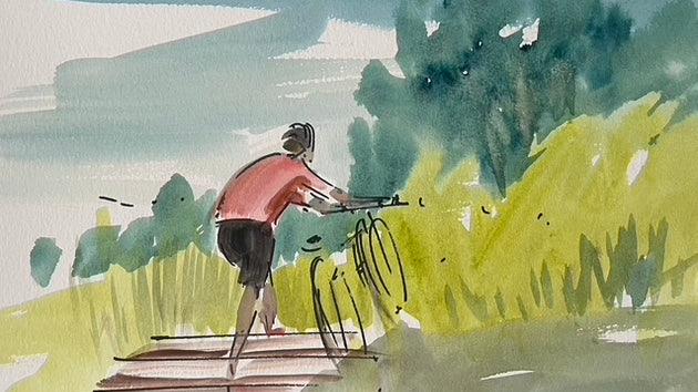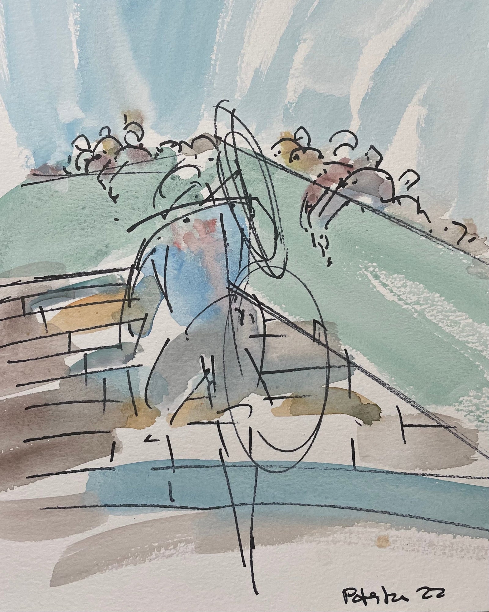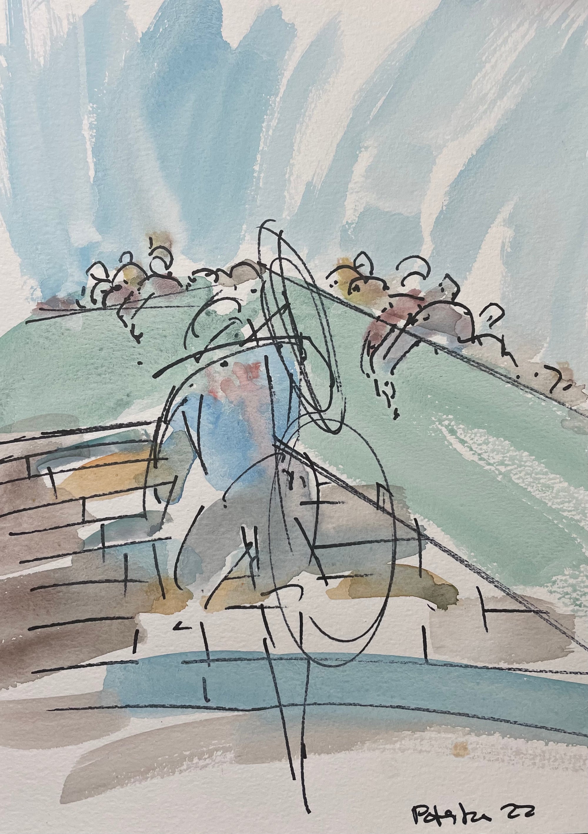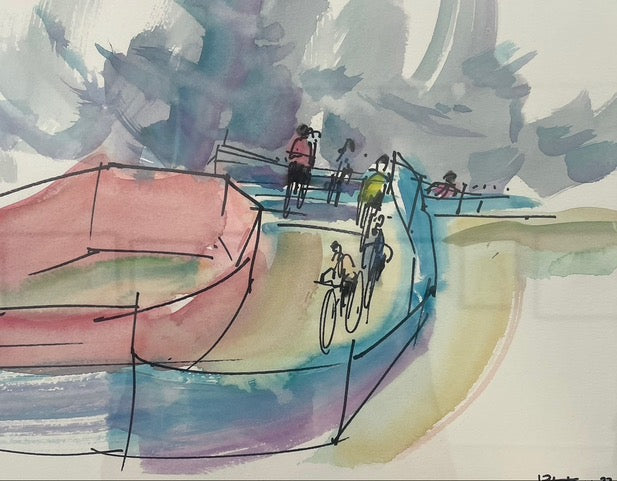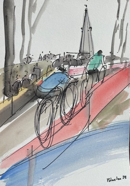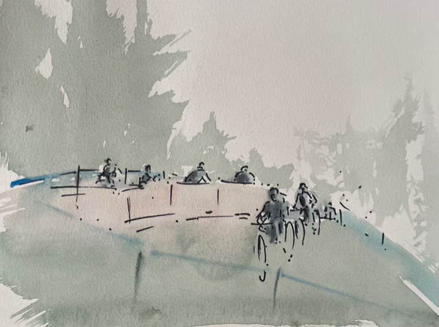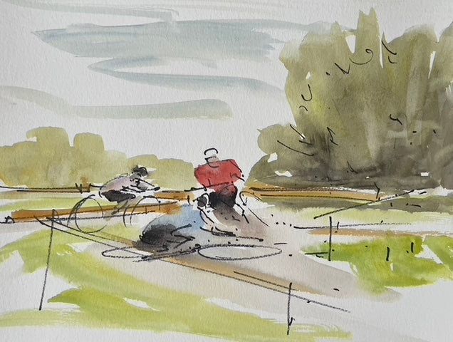 From my vantage point, at first sight of the racers, I would take a few phone shots. Then dropping the phone I quickly grabbed a pad and pen as they approached. I drew from a mental snapshot that I tried to hold onto as they flew past. Once lines had been established, I dropped the pen and took parting shots of the racers—hoping to get their numbers so I could verify whom I was documenting. I started to loosely lay watercolor in a gestural manner that supported the briskly made linework. I referenced my photos to ensure the blur that was their passing could be rendered with an accurate representation of kit color and design.