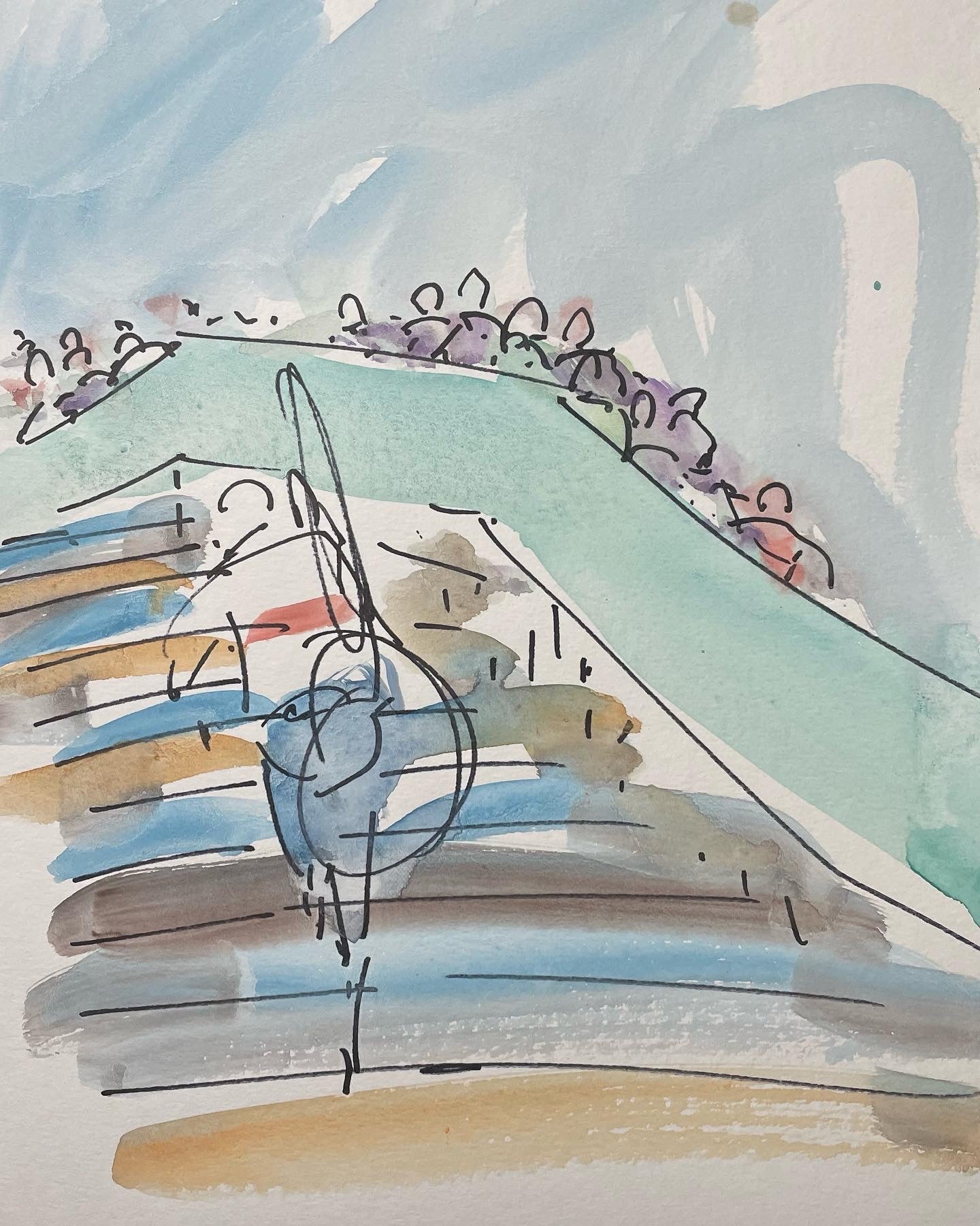 Since that first season, I have found sketching and painting to be a very intense way to watch the racing…instead of following the placings of the leaders or my favorite riders, I was now hyper focused on the positions of their bodies as they moved through the course, over barriers, around corners. I also stepped back to see the venue in the landscape and looked closer to frame the racing in the context of the spectators.