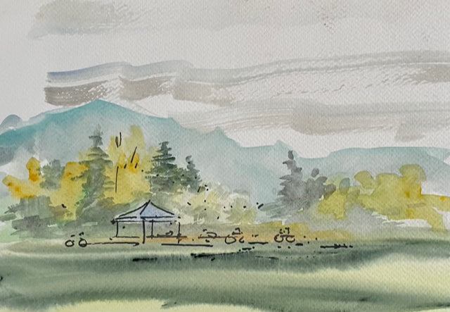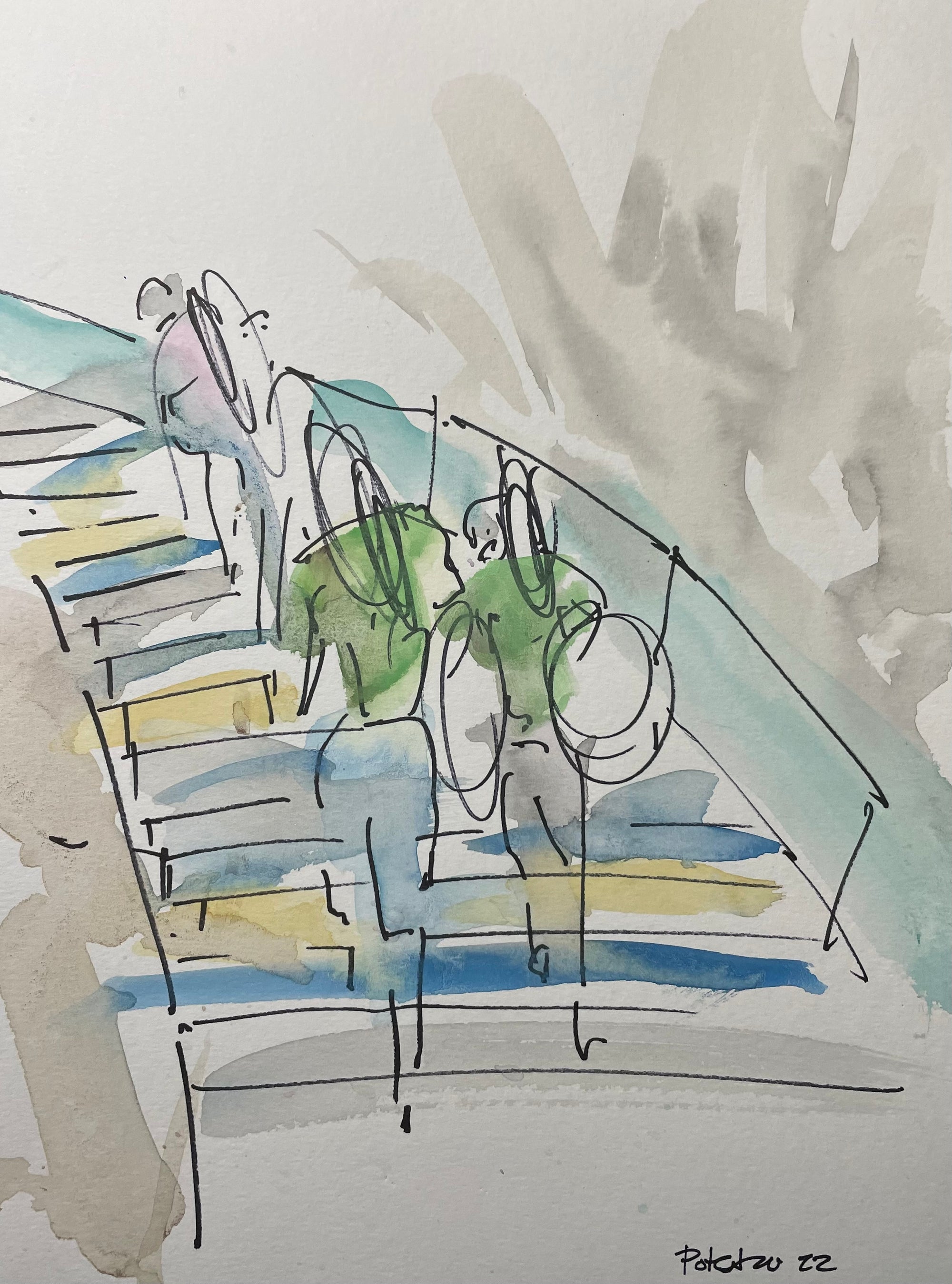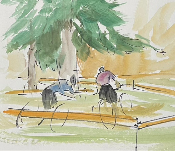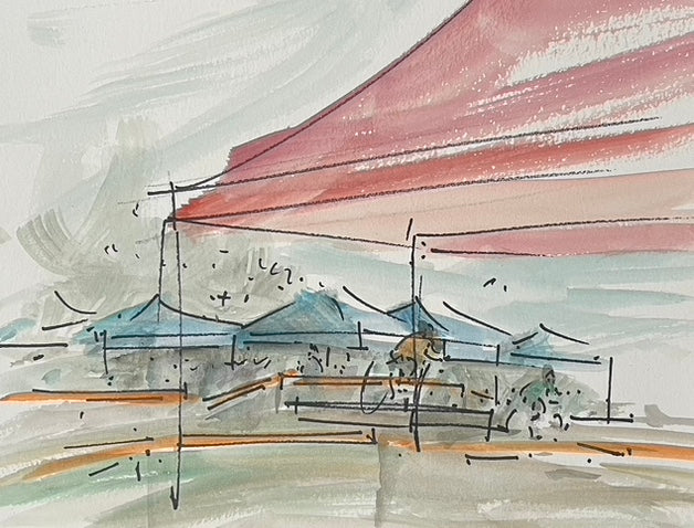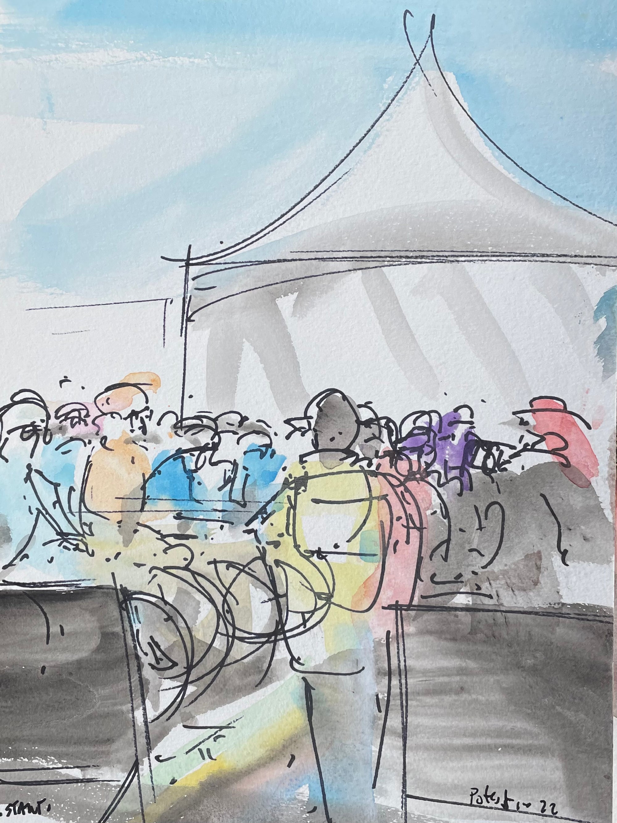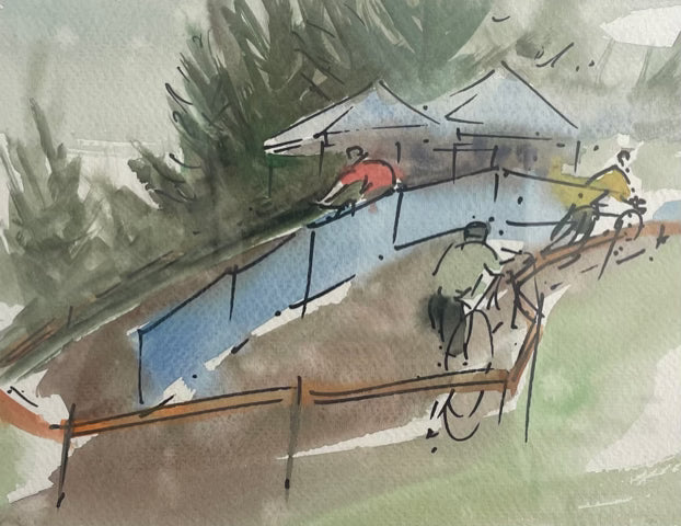 We have just concluded our 2024 Cyclocross Crusade Series, and I have a trove of sketches to post. As I look over the season’s work, I find I am getting better able to express the fluid motion of bodies in action. I am trying to find the right balance of detail and gesture, so that the work conveys the energy and beauty of the sport. I love the way in which the lines of tape and blocks of signage provide impetus to throw bold strokes of color across the page. I am enamored flooding the page with colors reflecting the change of season, from late summer’s dusky greens to the brilliant golds and reds of fall. Jerseys, hoodies and tents provide blocks of shape and color.
