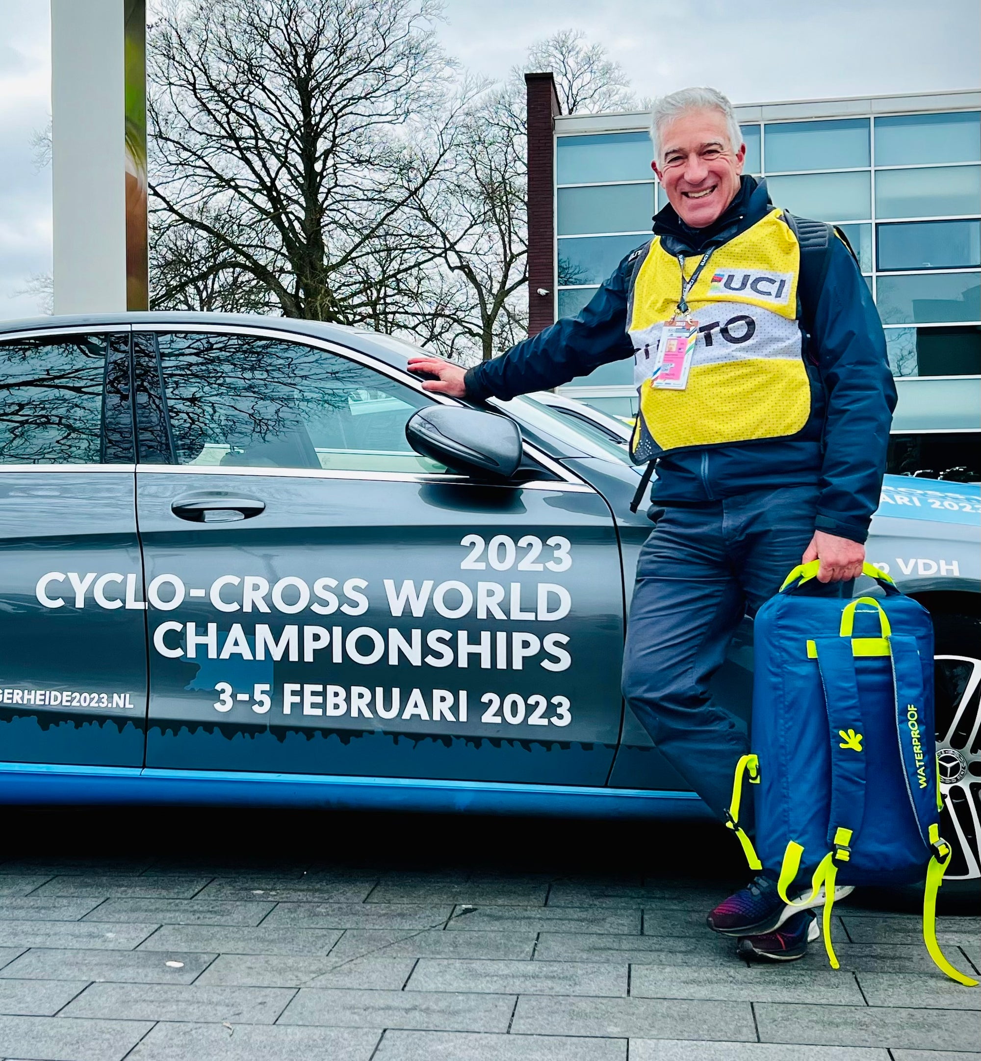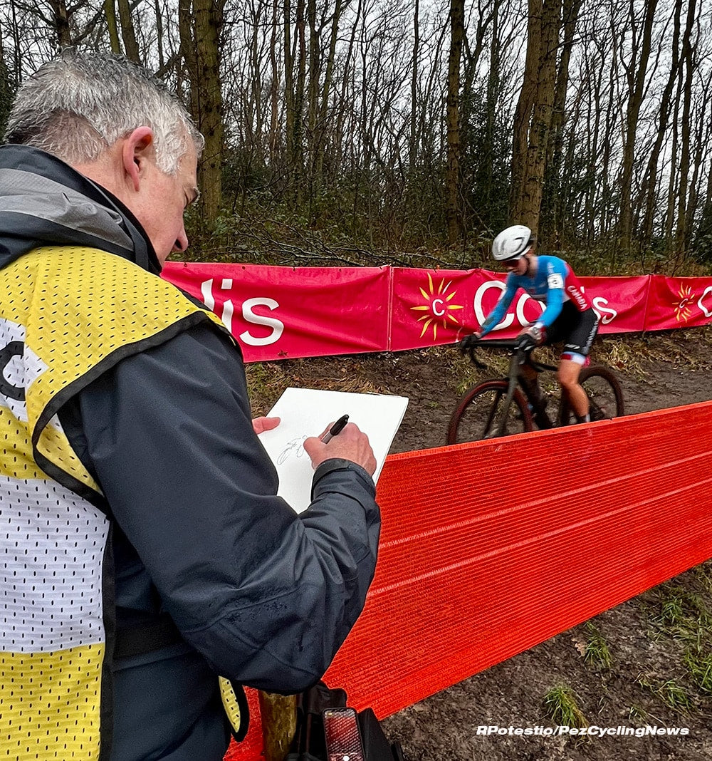 Standing at the top of the iconic Stairway to Heaven before the first race of the 2023 Cyclocross World Championships in Hoogerheide, I was as nervous as any staging racer. With the photographers setting up around me, I found my view angles diminish and my footing more precarious. I had on a UCI vest and press credentials hanging from a lanyard, but I was obviously lacking a camera. A photographer asked in French, “where was my gear?"… I shrugged and pulled out a sketch pad. “What the heck?" is a reasonable translation for his reaction….