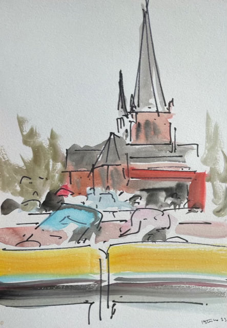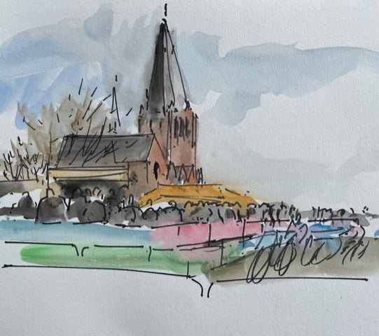 I would have only seconds to capture the action, so I drew the context in preparation for the arrival of the racers: the course fencing, the crowds pressed up against it, the flags, and banners and if possible, a landmark in the background--which in Hoogerheide was the church steeple.