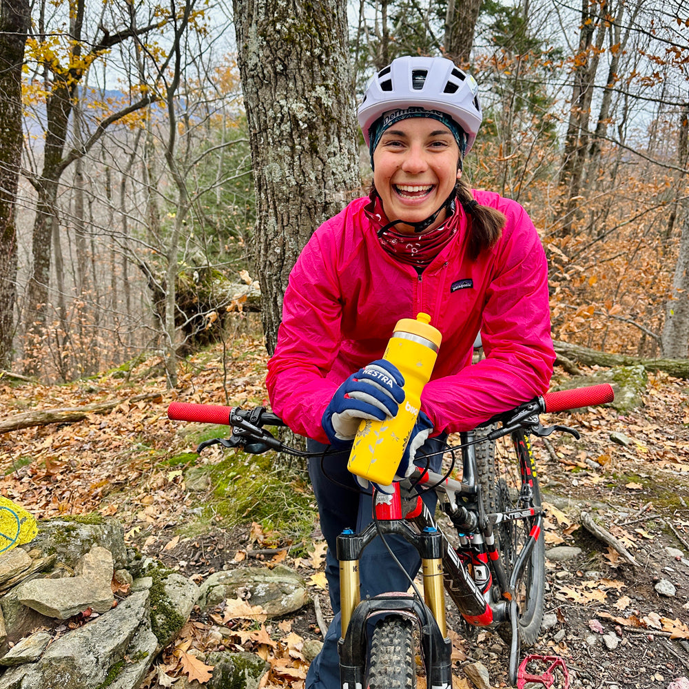 The bright yellow bottle features some sunflowers, a symbol for positivity in Julia's ski season.