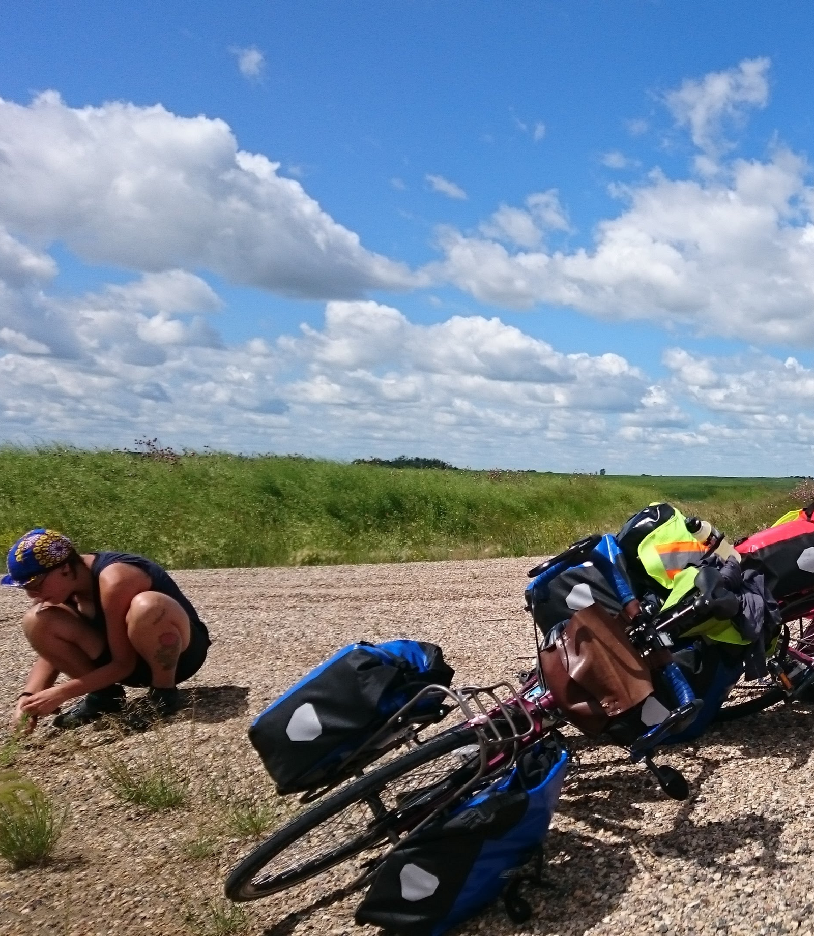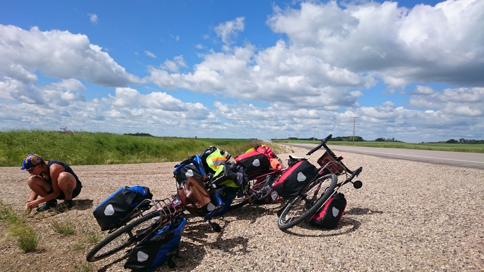 Two months later, Mat and I found ourselves bike touring down a remote, dirt farm road near the Alberta-Saskatchewan border, in a place that felt like the edge of the world — dry, desolate, and silent, with only the blazing sun and a faint breeze moving the parched earth.