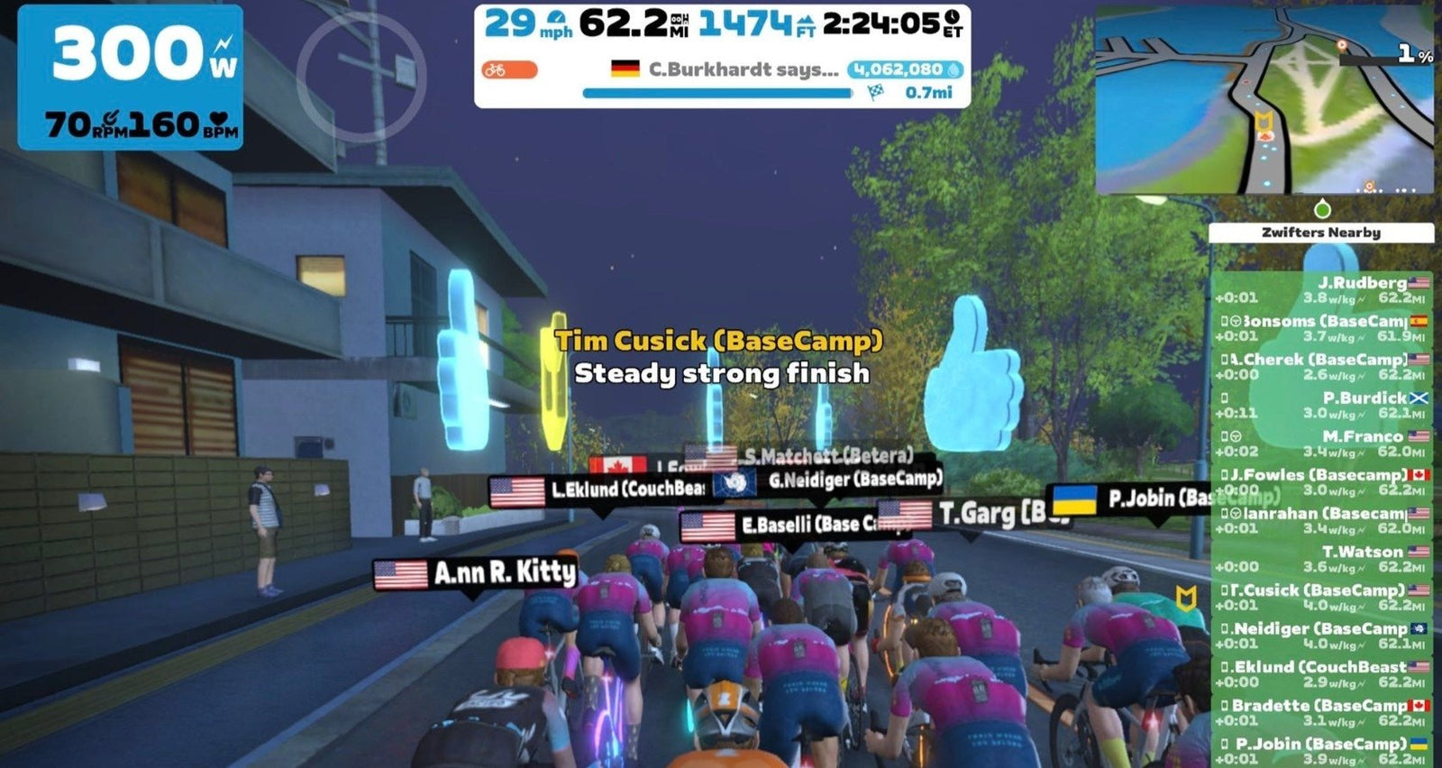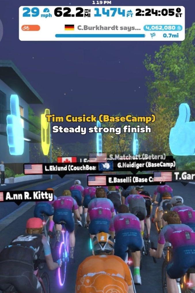 Despite my hesitations, I ended up riding indoors quite a lot. But very quickly I went from dreading indoor sessions to looking forward to them. Every Tuesday and Thursday I’d join the public group Zwift rides. The coaching team would share the why behind the training and provide tips for executing the workout as we rode. The athletes on the ride would all chat with one another, sharing motivation, telling stories, and making jokes. We were based in all different parts of the world, riding in our garages or living rooms or basements, but we were doing it together. Every weekend we’d have private meetups where we’d knock off long trainer sessions, talking about movies, books, recipes, sports, families - everything and nothing - while it snowed or rained or hailed outside. And once a month we’d join together for a ‘challenge event’, followed by a Zoom happy hour.