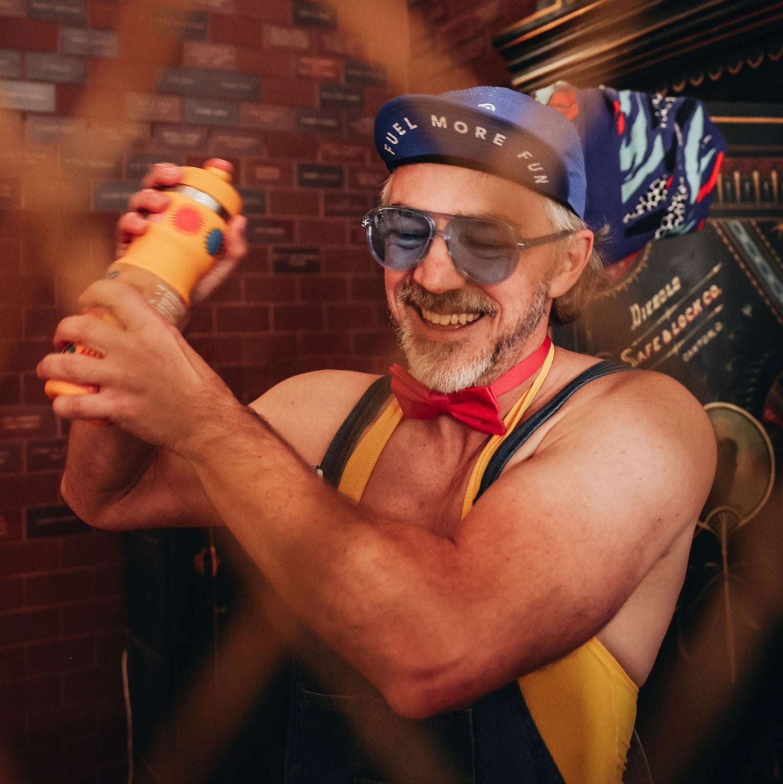 Being a Bivo bartender one night at the Momentum art show over the weekend of Rebecca’s Private Idaho. Mark seriously loves a ludicrous outfit so he was thrilled to dress up and mix up cocktails in Bivos for all the attendees of the art show.