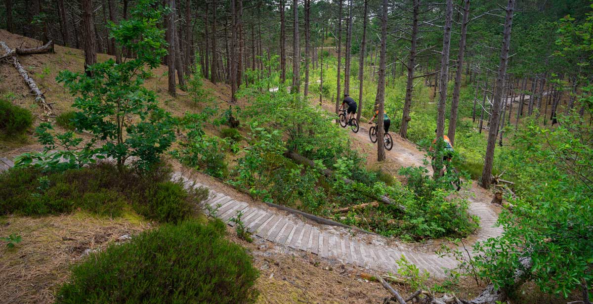 The Schoorl mountain bike trail consists of narrow singletracks winding through forest and dunes. These are combined with short but punchy climbs, fast descents, and surprisingly technical sections. Sand always plays a leading role. Sometimes it is firm and fast, sometimes loose and tricky. Riding in sand quickly teaches you that forcing things does not work. Relaxation is essential. Looking ahead, letting your body move with the bike, and holding the handlebars lightly, like holding a small bird you do not want to squeeze, make all the difference.