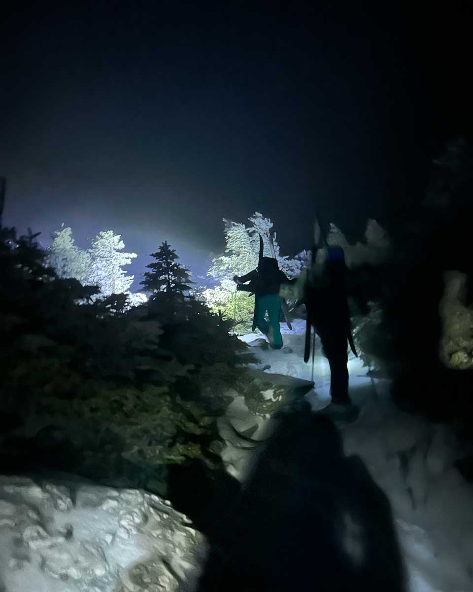 Slanted rain turned to snow as we neared the summit. I continued leading the pack, the rhythmic trudging lulling my mind away from the anxiety and exhaustion that had been creeping in since the sun went down two hours earlier. Suddenly, I was stopped by my friends. In the fresh snow, I had led us through the trees and off the trail. It took a few minutes to backtrack back to where we presumed the Long Trail would be under the blanket of white. The easily navigable hike we had all enjoyed in the summer and fall would not be foolproof in these conditions.