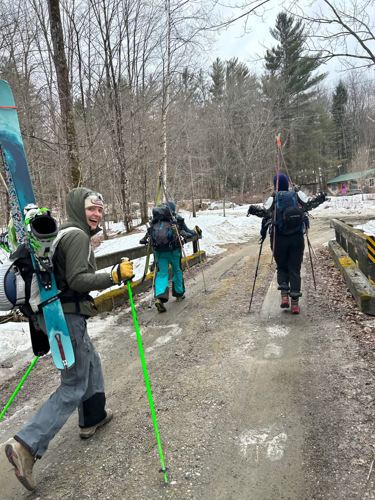 The descent quickly turned from silly to scary and downright painful. I frequently approached obstacles which forced me to take my skis off and throw them on my shoulder. Emma, Anika, and Nate graciously waited for me, but I felt myself lagging behind as they straight-lined down the trail with ease. I kept thinking it would be faster to simply scamper down the way I came up, but the rest of the crew was committed, so I did my best (and quietly shed a few tears as I went). I normally wince at carrying my skis on my shoulder from the car to the bottom of the lift, but somehow managed to carry them this way for miles while chasing the others down Camel’s Hump in ski boots that day.