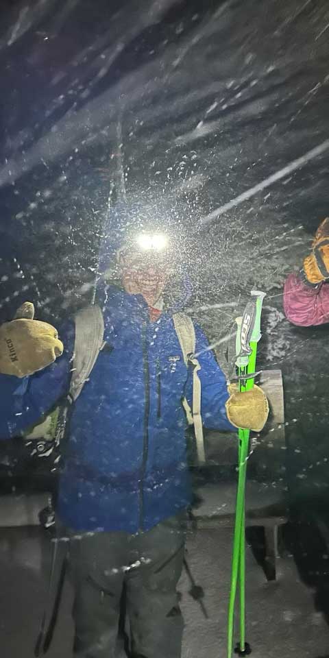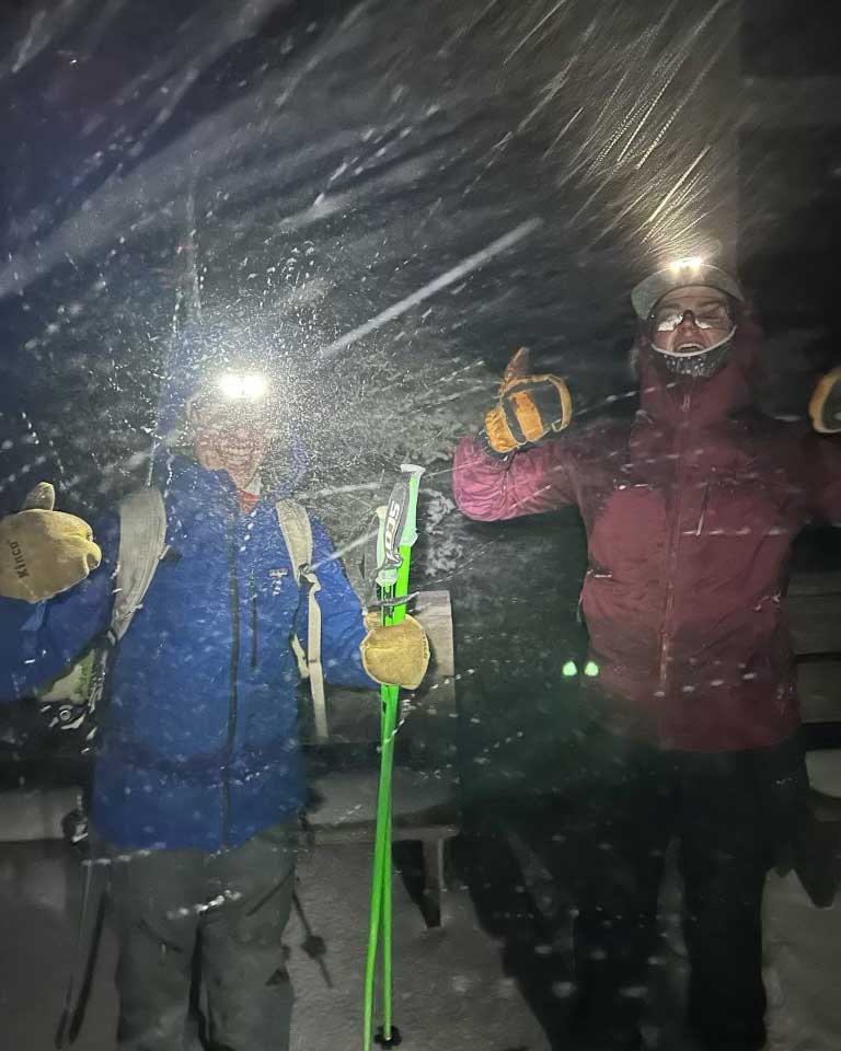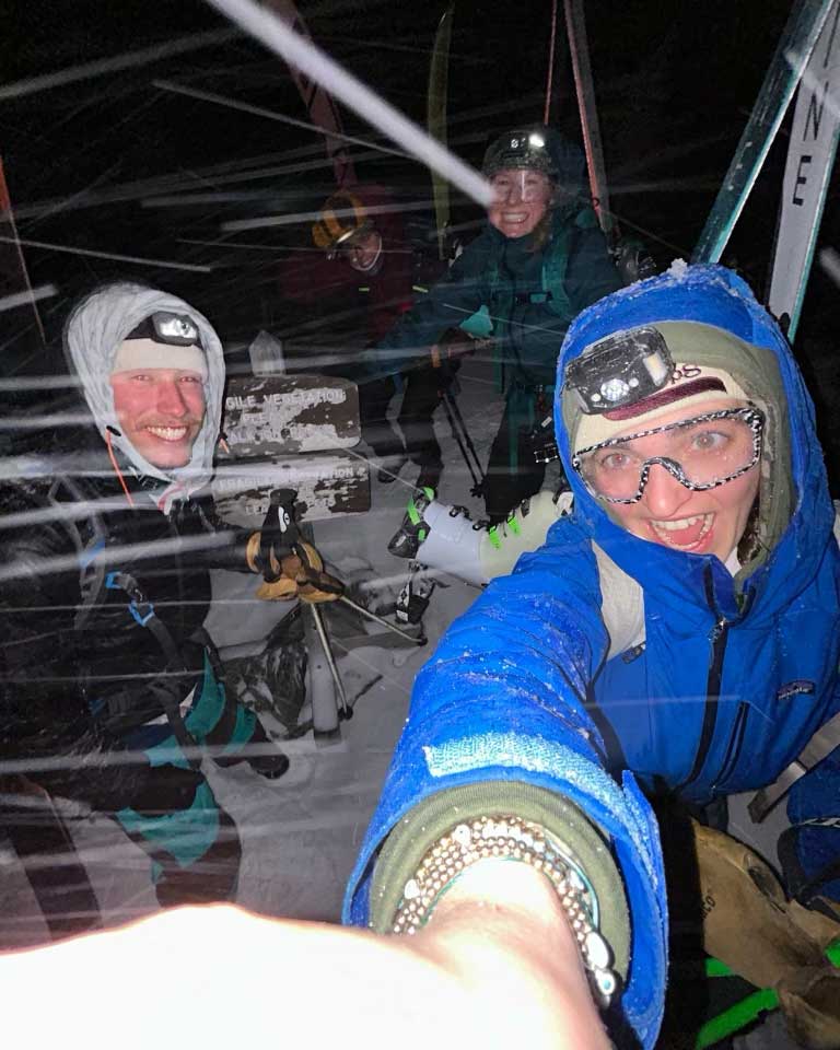 After a few more departures from the trail—always quickly corrected by Anika—we finally booted up at the Lincoln Peak lookout platform at 10pm. At long last, we could click in and blitz down to our destination using one of the fastest human-powered modes of land travel: skiing.