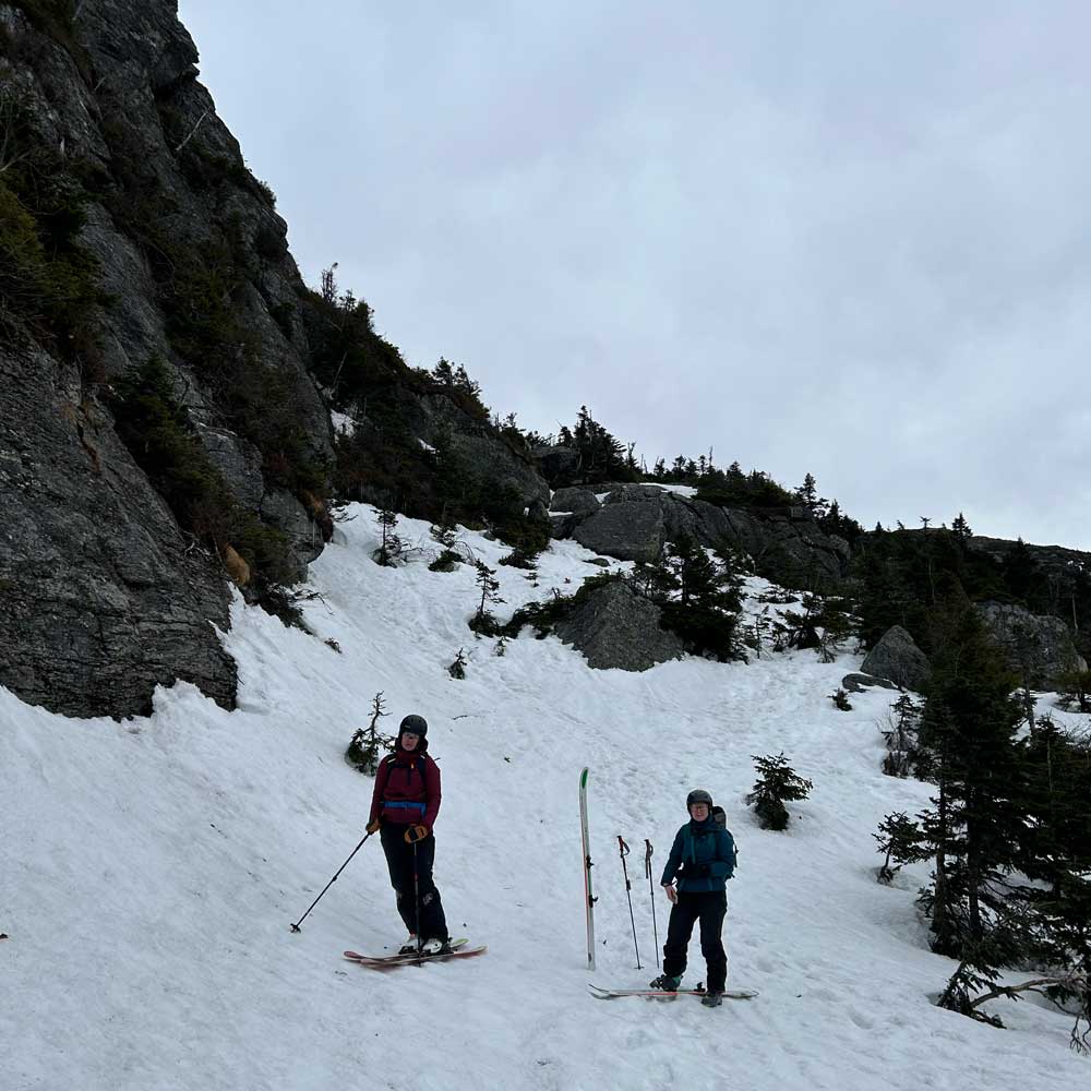 Our ascent of the Monroe trail was seamless. As we gained elevation we chatted, taking our minds off the daunting day ahead. We made it to the intersection with the Long Trail, near the summit, dropping our packs and skis. The trail up to the summit would be rocky, narrow, and lacking snow (on a good day, which this wasn’t). We hoofed it to the summit before quickly retreating from the high winds. Back at our packs, we started our transition, three hours in and still optimistic. The descent could best be described as harrowing.