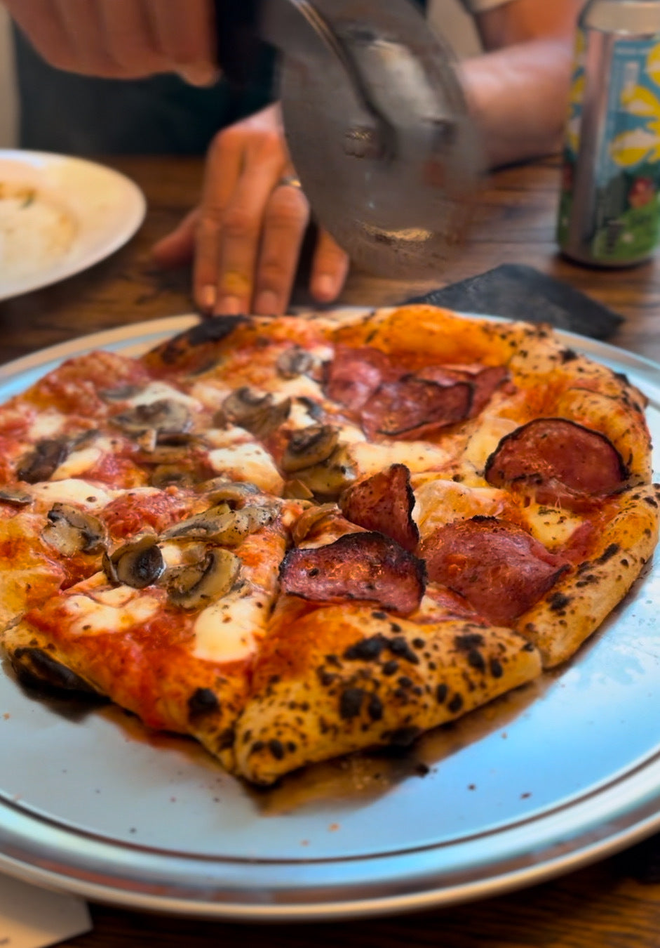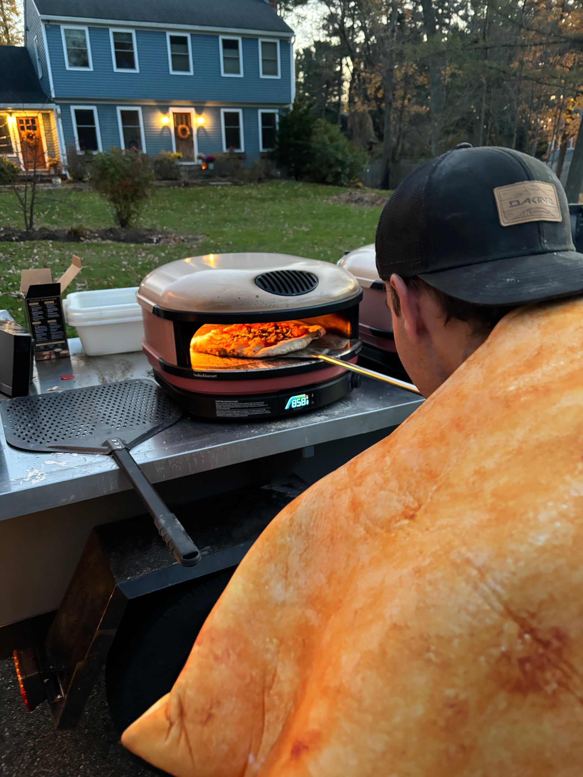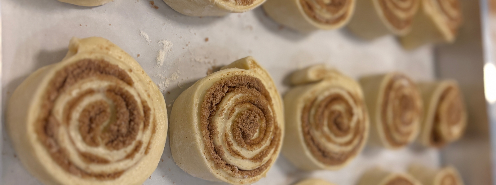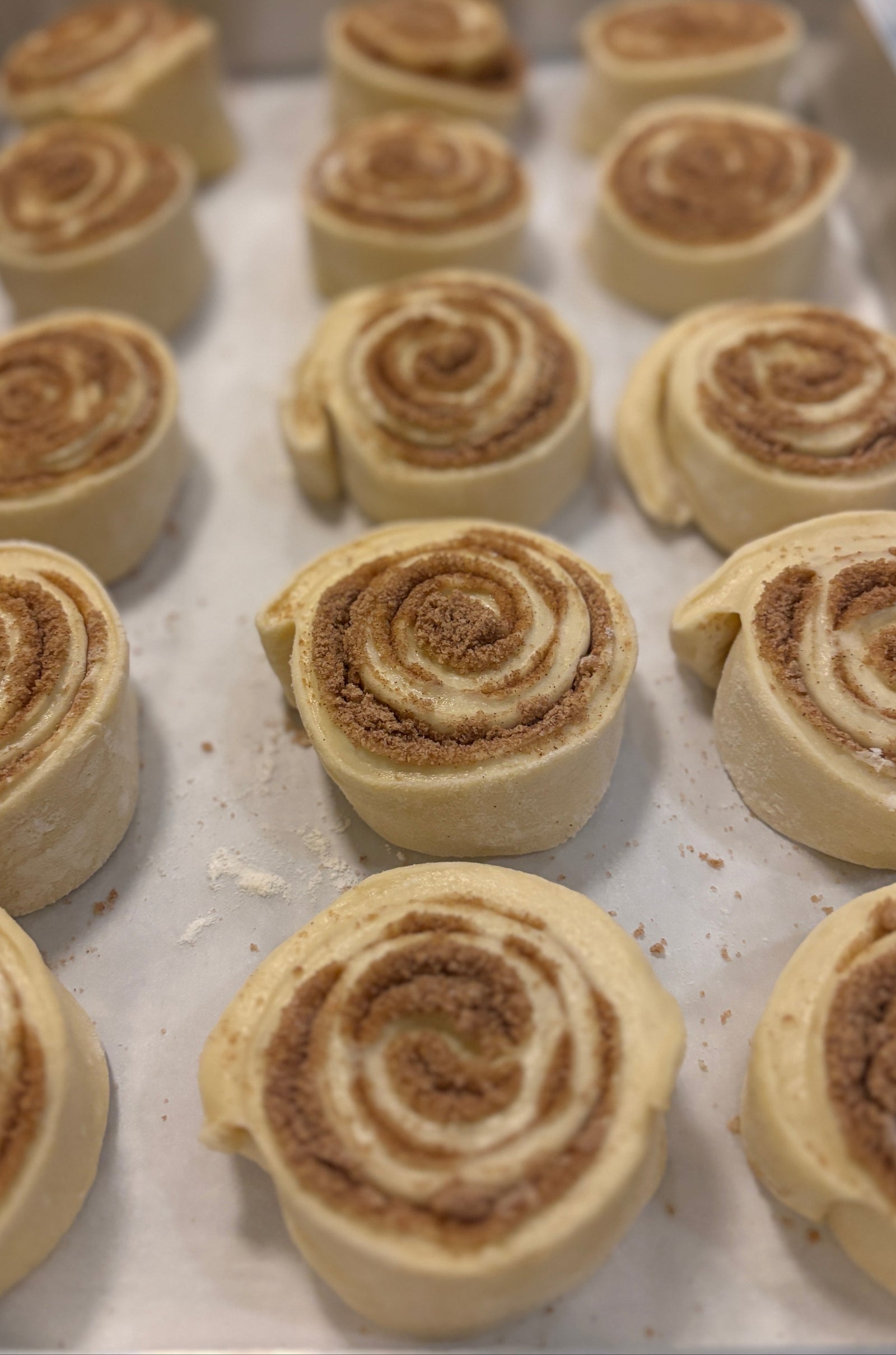 The bun and pizza baker is Mike, my husband, a regular guy, dad of two, and software consultant who, like many of you, tried his hand at making sourdough bread during the pandemic. Big baking names like Chris Robinson of Tartine Bakery and Maurizio Leo, author of "The Perfect Loaf" inspired him to dive into the science of dough. He loves the process, turning and rolling the dough. After many, many failed attempts to make all sorts of artisan breads and pizza, he started to have some mild success. He made pizza for our friends in California starting by using a grill, then an oven, then an Ooni oven. He made chocolate bread, some pastries, and dozens of artisan loaves. When we moved to Vermont, he honed his pizza-making by working for a local pizza caterer, stretching over 2,000 pizza balls during the summer of 2024, all the while experimenting with his own dough. The craft, if you can call it that, of making cinnamon buns is trial and error, pages of notes of little tweaks on a recipe. His pizza doughs grew in diameter. The flavor profile improved. Then came the cinnamon buns because every savory item needs a sweet sibling.