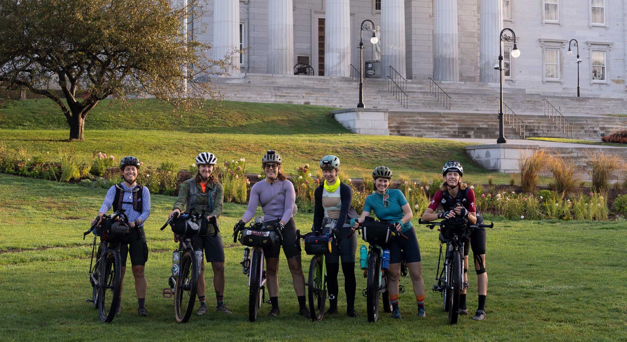Terrain along the route varies from some of Vermont’s finest champagne gravel to unrecognizable, certainly forgotten ‘mail routes’, and one notable hike up and over the infamous Glastenbury Mountain. Most riders, but not all, select a mountain bike to ride this route for the comfort gained over long days on rough terrain. Historically, registration is about 50 total riders, with only a handful of women. Riders have plenty to look forward to– early foliage, mountainous views, remote sections of the state, and general stores to fill their bellies. It is, however, no small feat. Even getting to the starting line, brimming with nerves, is an accomplishment all in itself. With so many unknowns on how the following days would unfold, photographer Kelly Burgess documented the 6 women toeing the start line to commemorate the start of the adventure.