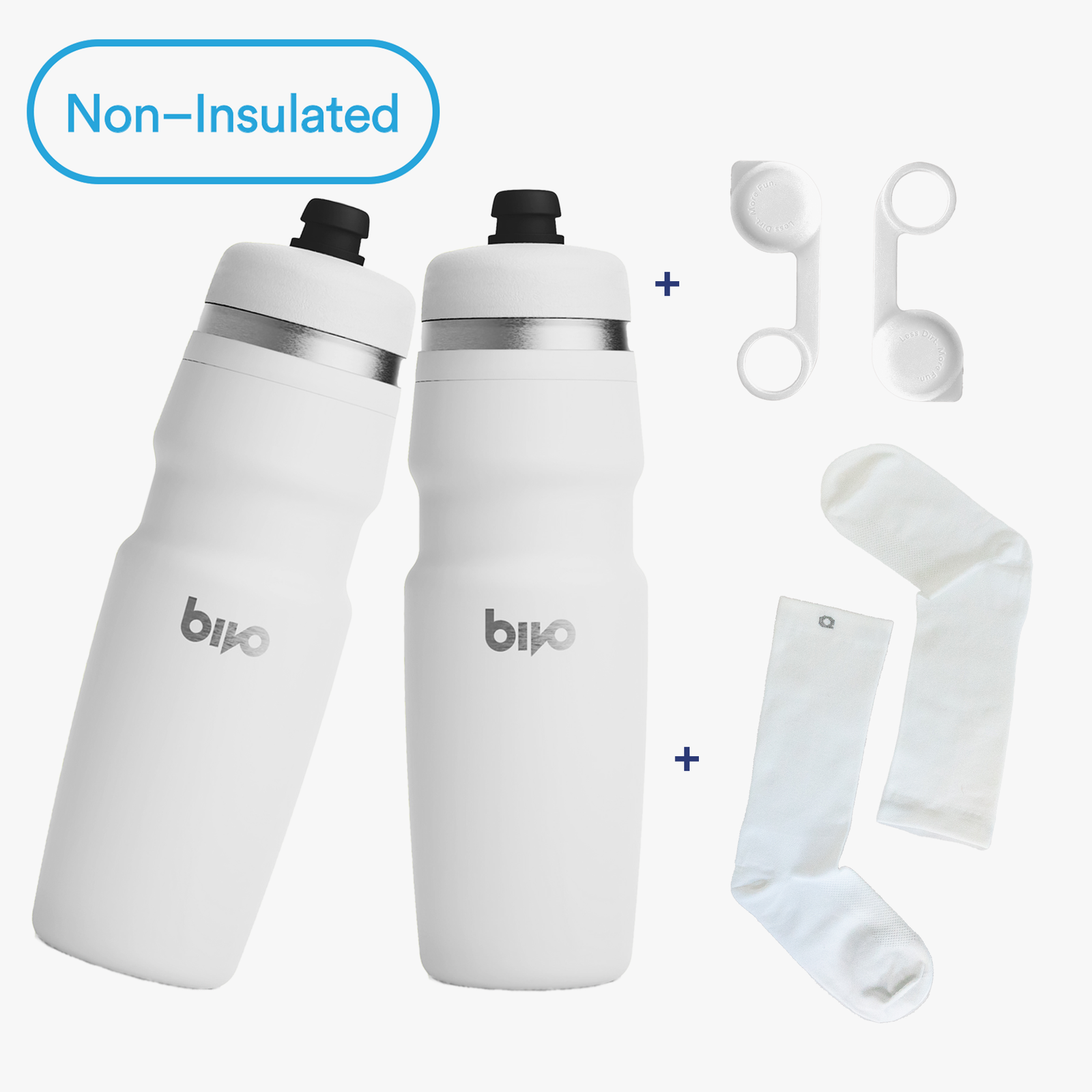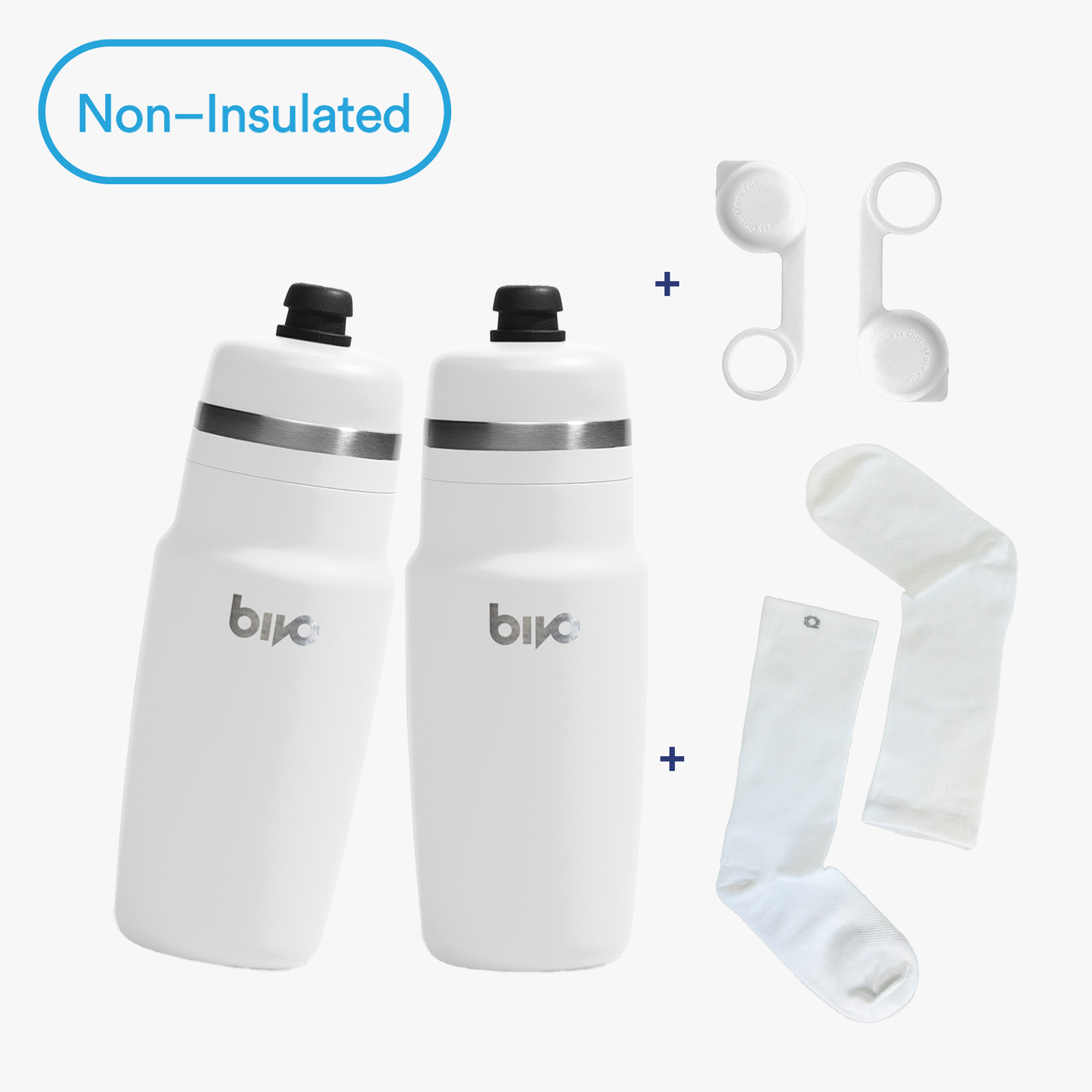 But!! We wanted to top it all off by offering the Ultimate Roadie Bundle, featuring a pair of White Bivo bottles (because, obviously, matching bottles are a must!), a set of Qeja Race Day all-white cycling socks, two free white dirt caps, and free shipping on US orders.