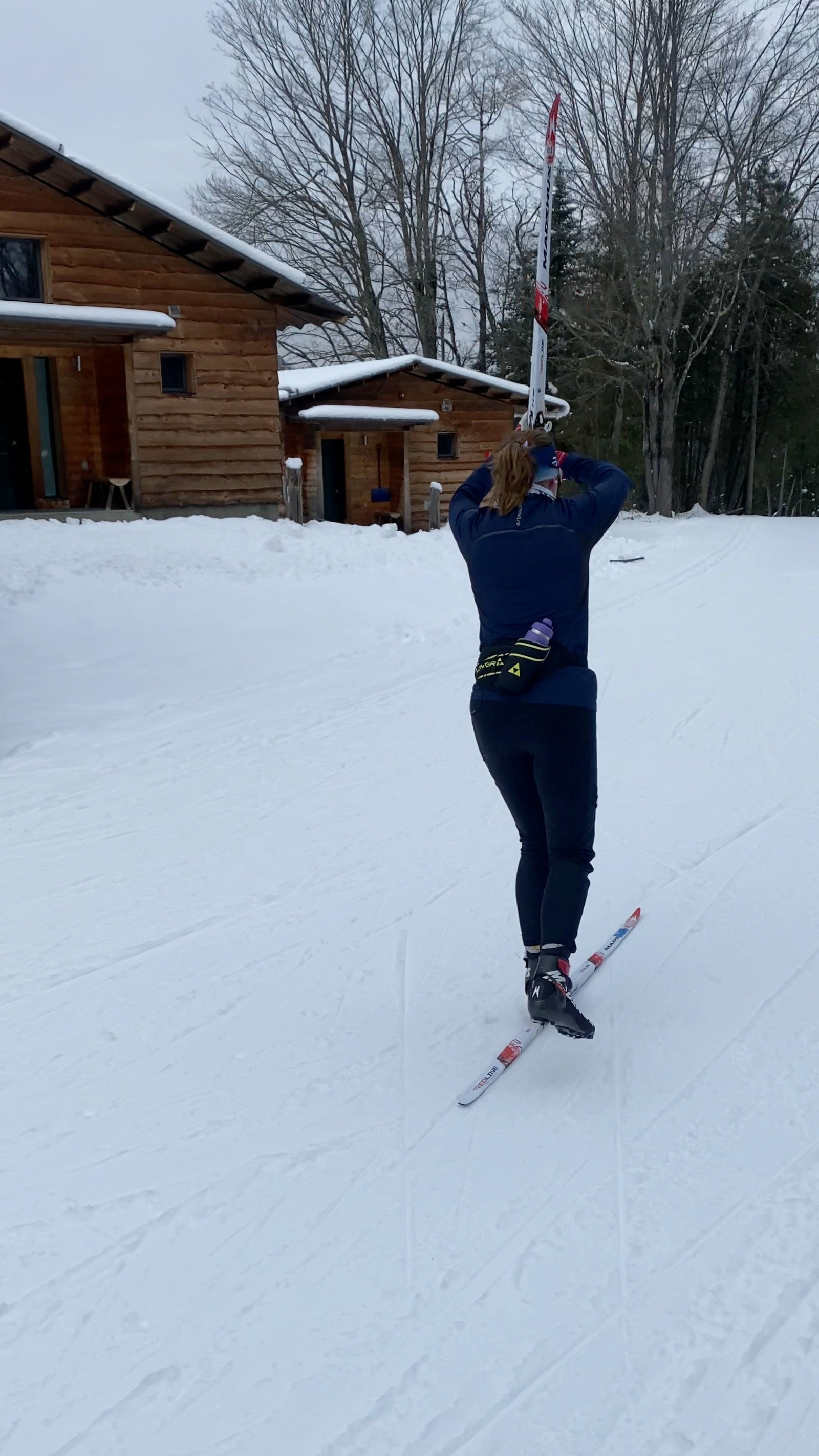 We don't recommend skiing with one ski above your head, but we do recommend staying at the Craftsbury trailside cabins!